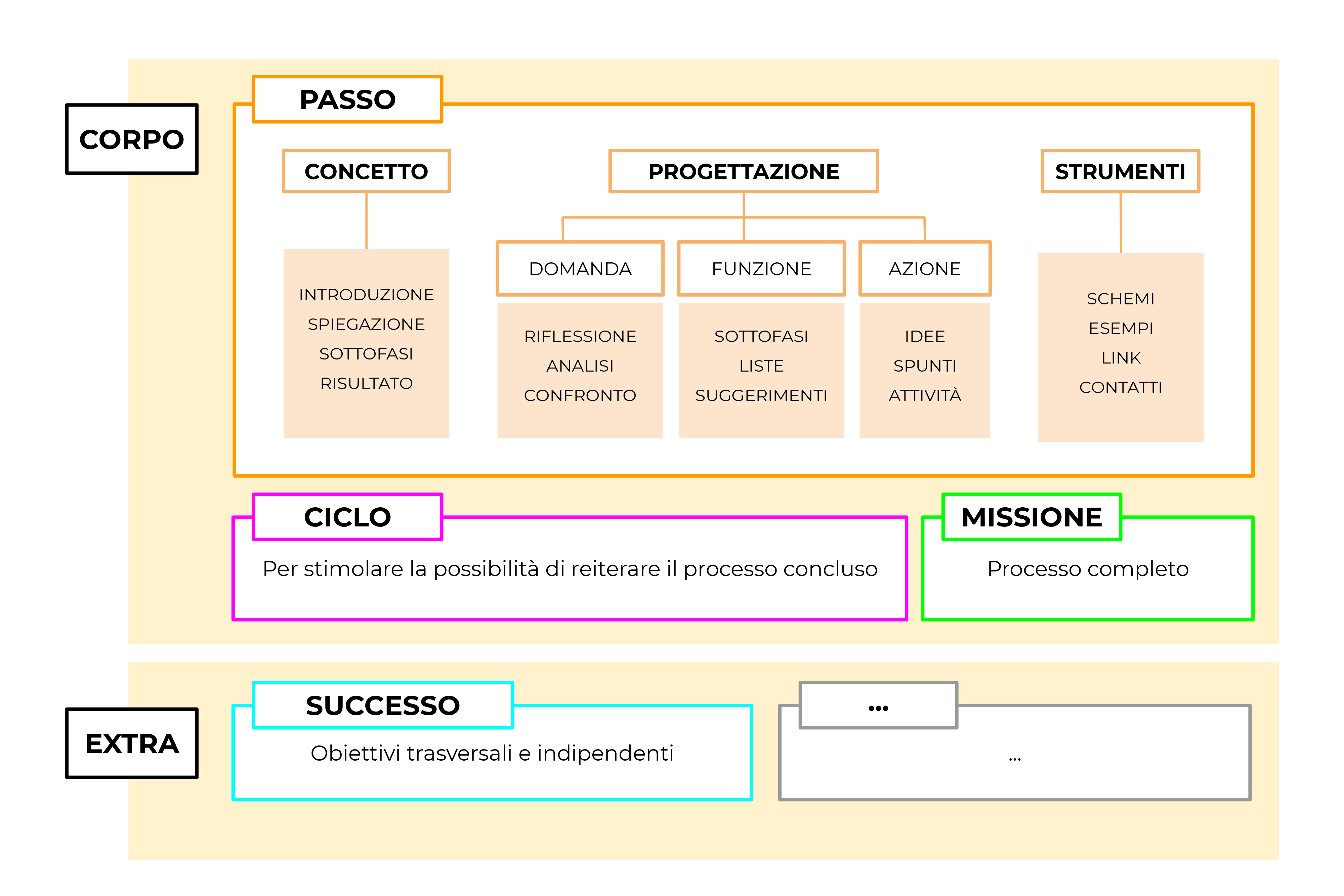Questions such as "What should I do?" "Can I go on?" "How do I do it? "How do I do it?" "How can I organise the details?" "What are the priorities?" had to be answered through the guide. To do this, we decided to enrich the text with additional resources, and to divide each step into 1. Concept (an introductory text explaining the scenario and the objectives to be achieved) 2. Questions (divided into considerations, analysis and debates) 3. Tools (tips, advice and working tools) 4. Output (verification of the learned notions and results).