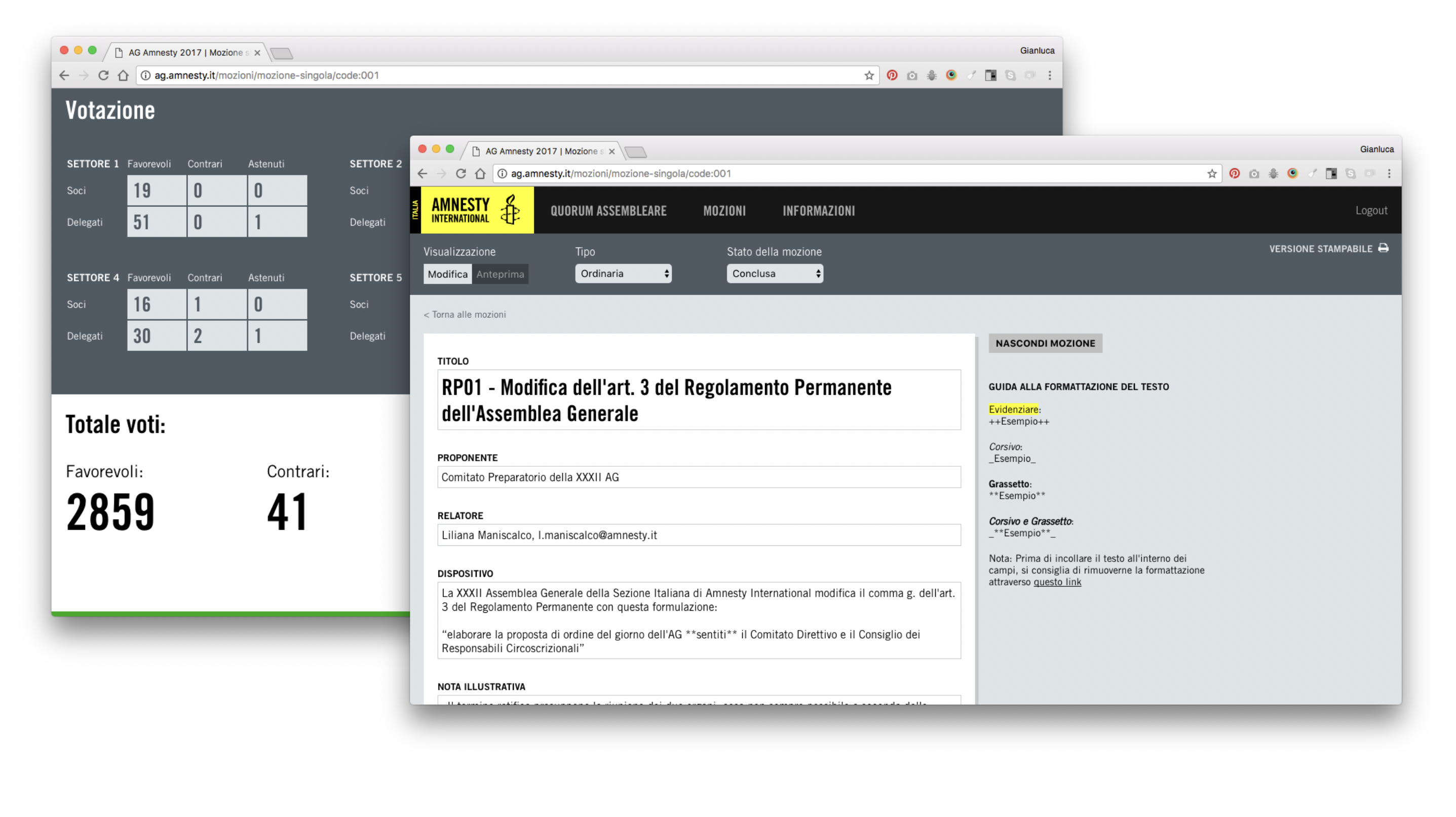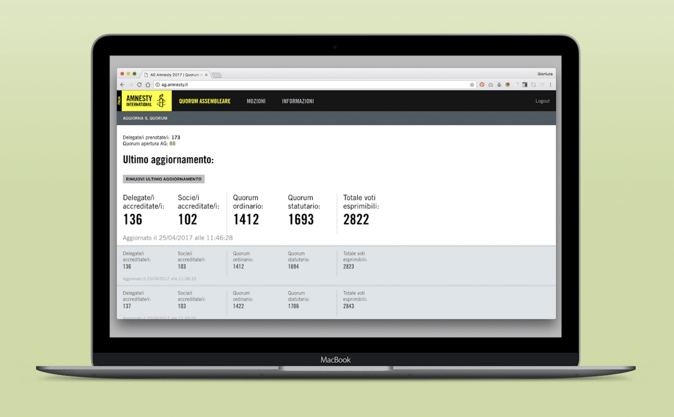 Amnesty International Italy asked us to design and develop a web-app that would allow the participants of the General Assembly to view the quorum, the motions and the outcome of the votes in real time, through a lightweight tool, with a simple interface with particular attention to data protection.